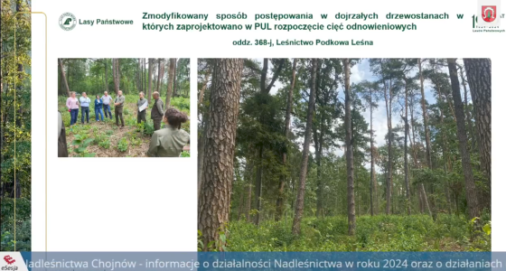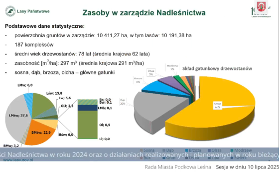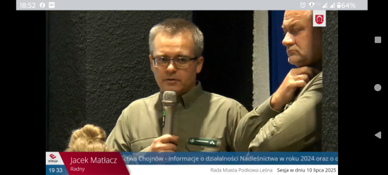 Na ostatniej sesji Rady Miasta Podkowa Leśna Nadleśniczy Artur Pacia wraz z leśniczym leśnictwa Podkowa Leśna Tomaszem Szymańskim omówili działania realizowane przez Nadleśnictwo Chojnów w 2024 roku oraz przedstawili plany na rok 2025 – ze szczególnym uwzględnieniem prac prowadzonych w "Lesie Młochowskim", tj. w granicach miasta Podkowa Leśna.